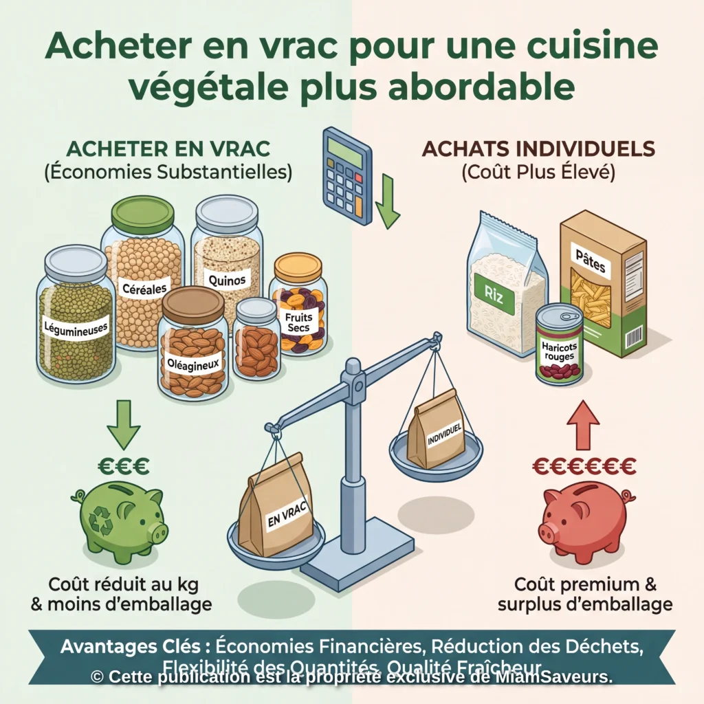 Un point peu connu concerne les produits transformés végétaux. Farines spéciales, protéines végétales texturées, mélanges pour falafels ou pancakes peuvent parfois être plus chers en vrac car ils sont positionnés comme produits premium. L’économie se fait surtout sur les bases brutes.