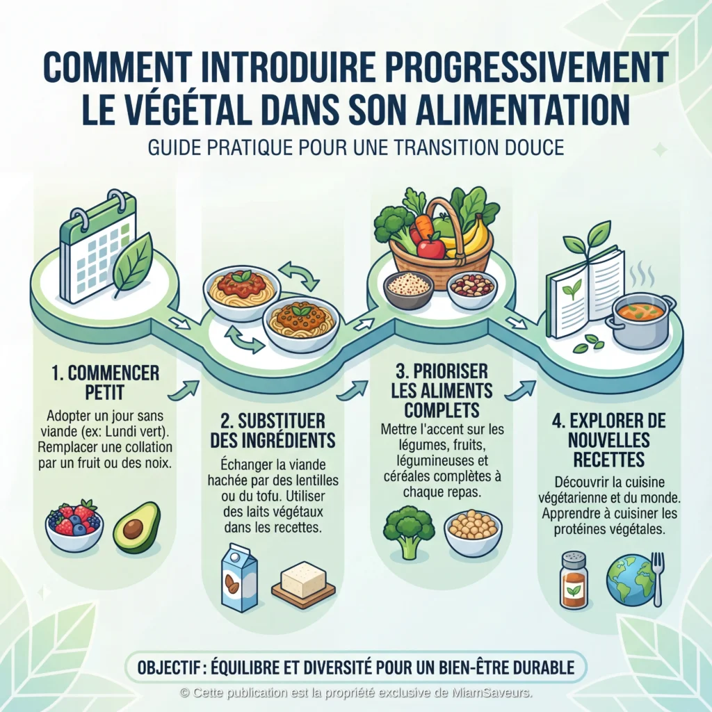 Commencer par ajouter un repas végétal par semaine est souvent une excellente approche. Puis, petit à petit, remplacer certains ingrédients animaux par des alternatives végétales simples, sans chercher la perfection.