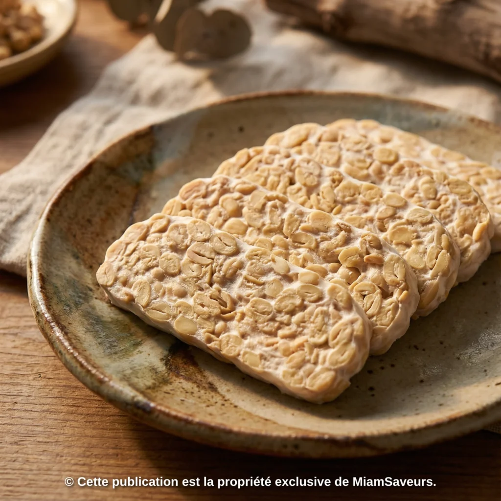 Le tempeh est également issu du soja, mais sa fabrication repose sur un principe totalement différent. Originaire d’Indonésie, il est obtenu par fermentation de graines de soja entières à l’aide d’un champignon naturel. Cette fermentation forme un bloc compact où les graines restent visibles.